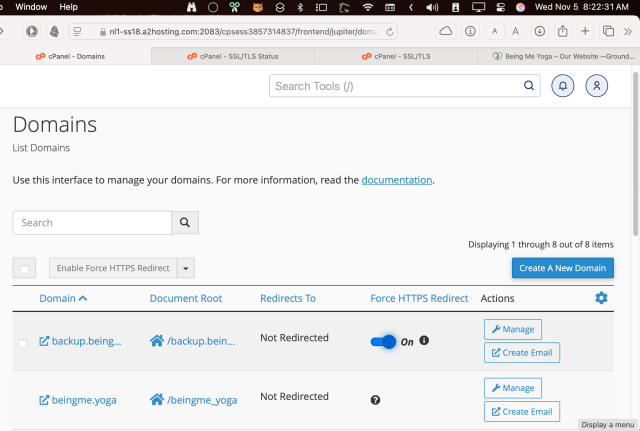 • cPanel “Domains” interface shows HTTPS Redirect = ON for backup.beingme.yoga.