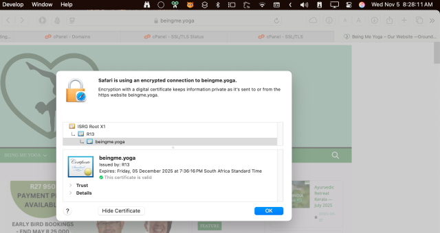 • “This certificate is valid – expires Friday, 05 December 2025 at 7:36:16 PM SAST.”