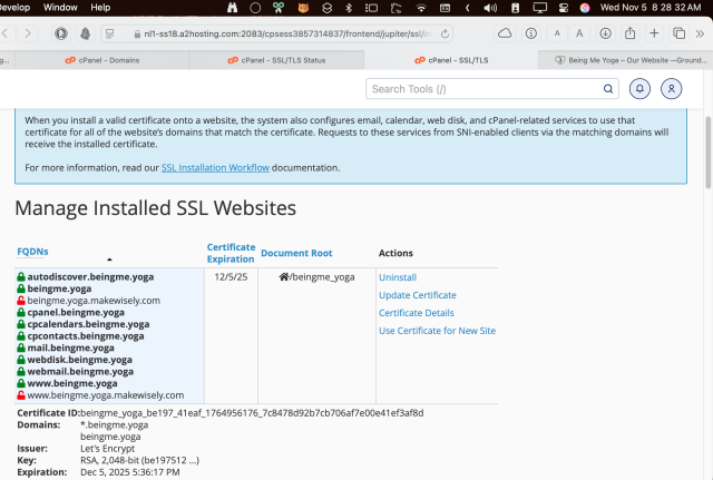 • Issued for: *.beingme.yoga (wildcard covering all subdomains)