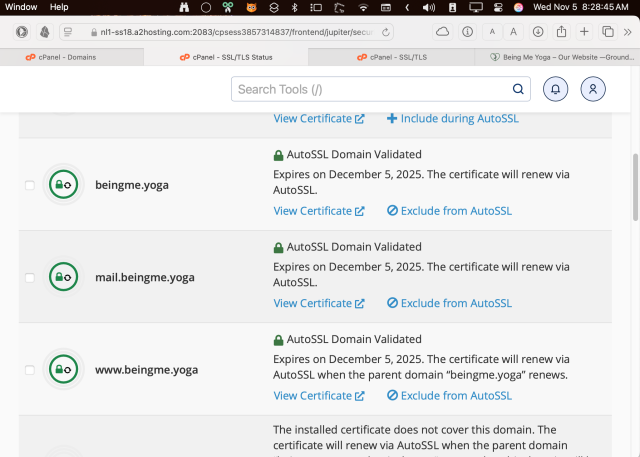- Installed and configured AutoSSL wildcard certificates (*.beingme.yoga).